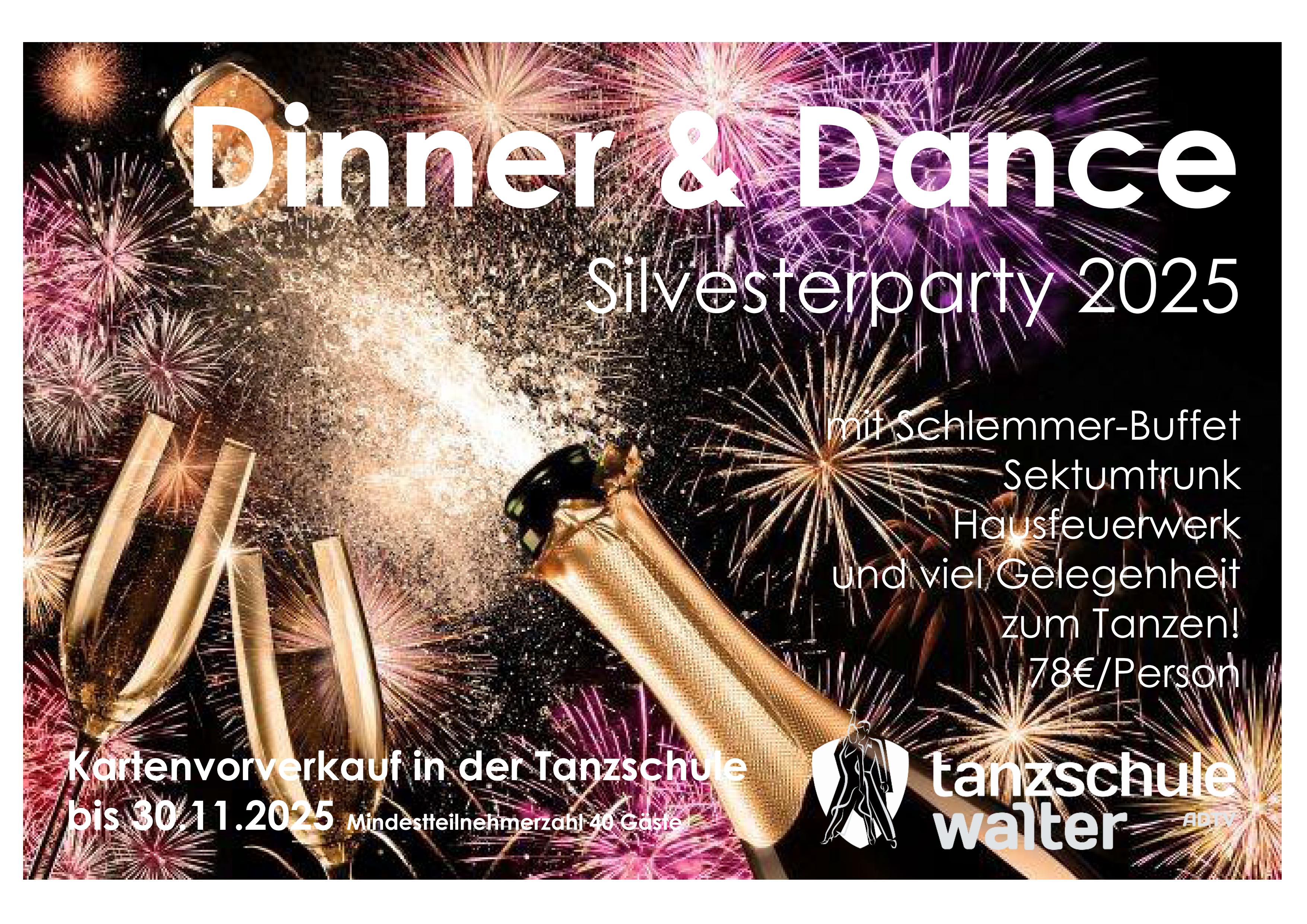 Kartenvorverkauf in der Tanzschule bis zum 30.11.2025. Bitte beachten Sie, es gibt keine keine Abendkasse. Im Preis (78,00€ p. P.) enthalten sind ein köstliches 3-Gang Schlemmer-Buffet von Kumpf Catering, ein Sektumtrunk um Mitternacht und unser spektakuläres Silvesterfeuerwerk im Innenhof der Tanzschule. Sichern Sie sich jetzt Ihre Tickets und feiern Sie mit uns den Jahreswechsel in stilvollem Ambiente! Wir freuen uns auf einen tollen Abend mit Ihnen!